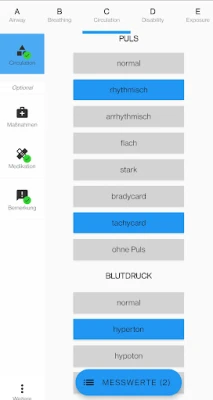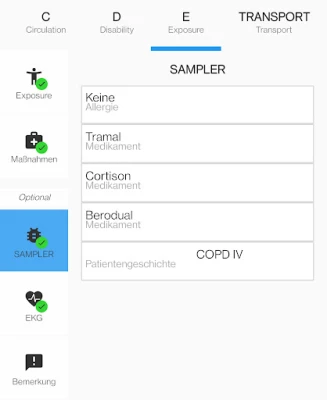 EMS Protocol is the first app to comply with the latest guidelines for patient care. EMS Protocol enables documentation according to the ABC standard and supports the immediate recording of the measures taken. The application incorporates well established patterns for medical assessment including SAMPLER, SICK and GCS.
