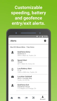 Key Features • Real-Time GPS Tracking – Know where your vehicle is at all times • Speed Alerts – Establish a speed limit and be alerted any time your vehicle exceeds that speed. • Low Battery Alerts – Monitor and be notified of your vehicle's battery to avoid the hassle of your vehicle not starting. • GeoFences – Create geographic points of interest to be alerted when your vehicle arrives to or leaves from those areas.